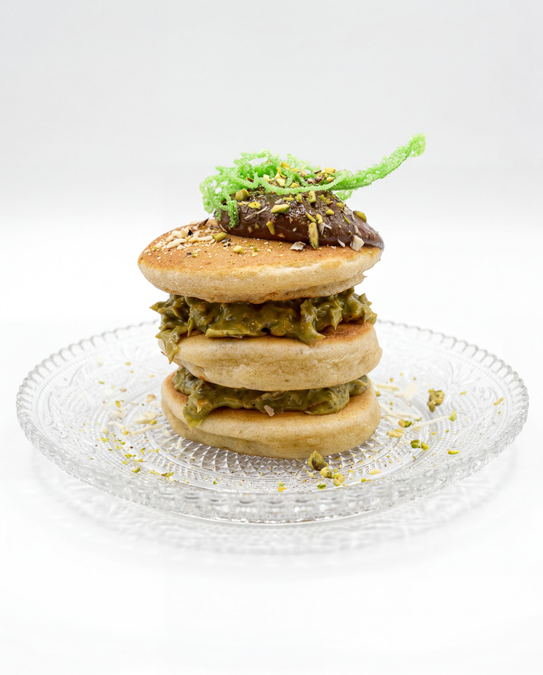 Mini tortitas recheas con crema de pistacho crocante "estilo Dubai" cun espumoso de chocolate negro.